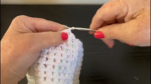 - Work single crochet stitches evenly around the band edge, about two stitches per rib section.