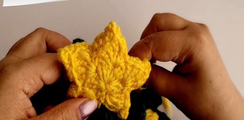 - Using red or yellow yarn, chain 4, make 6 long double crochets into first chain, close loops together, and fasten off.