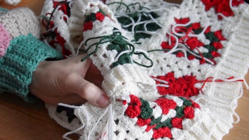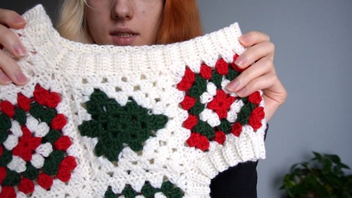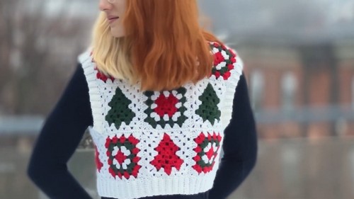 This festive crochet sweater vest is a charming handmade piece created using colorful Christmas-inspired granny squares. Each square is stitched individually, then arranged and joined to form the vest shape. The project offers flexible sizing by simply adjusting the number of squares to your preferred fit.