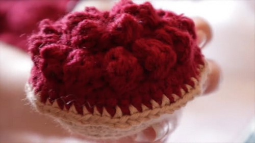 - Use the light brown yarn to attach the cherry filling to the pie bottom.