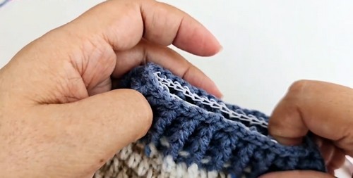 - With 2 mm hook and elastic thread, work 1 round of SS along cuff edge for stretch.