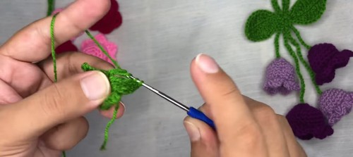 - Insert one end of a green stem chain through the flower center and tie tightly with the flower yarn tail.