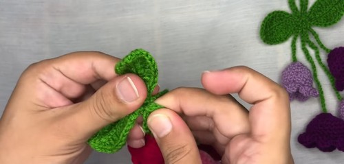 - Work a second leaf onto this chain using the same steps, then secure and cut the yarn.